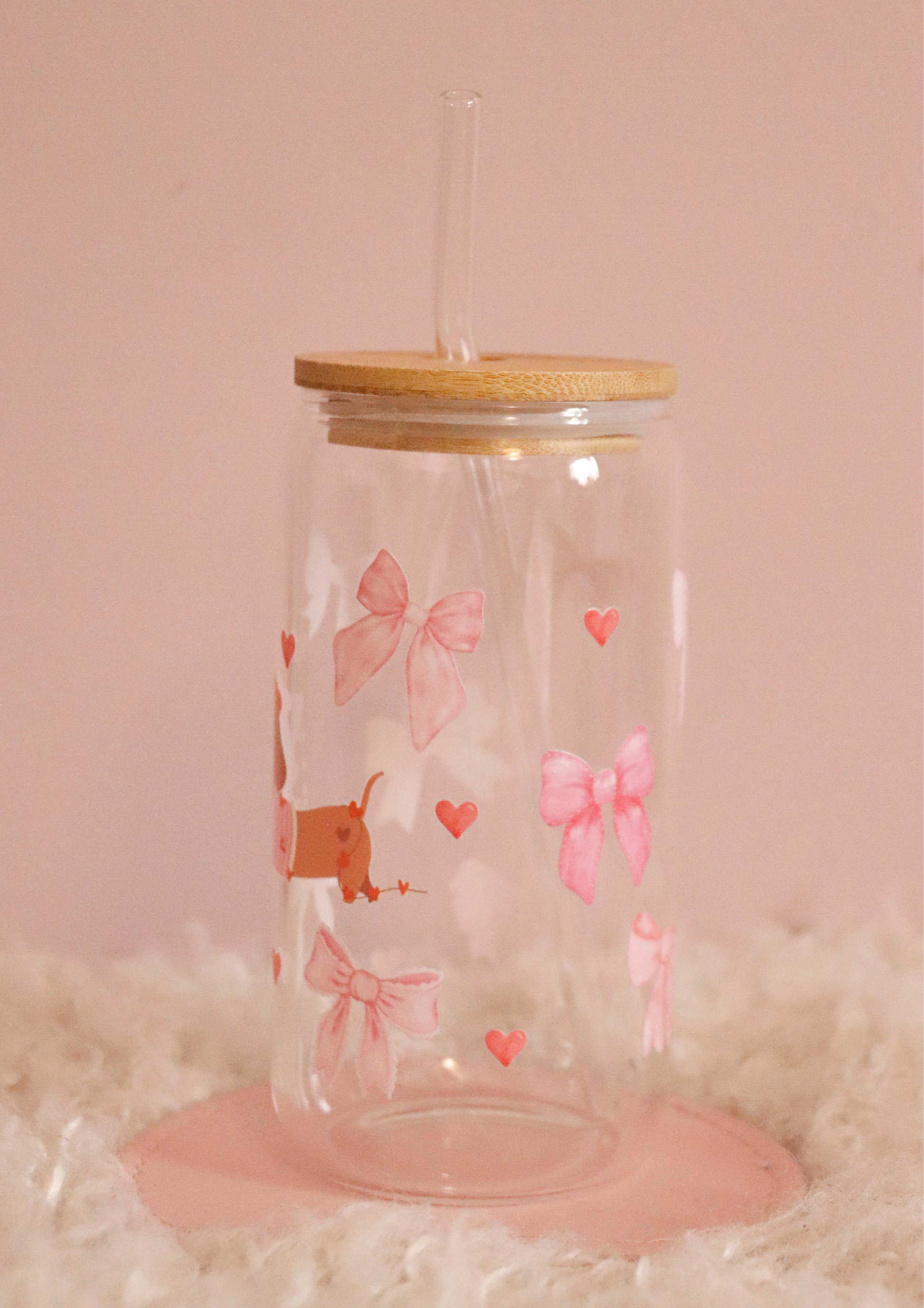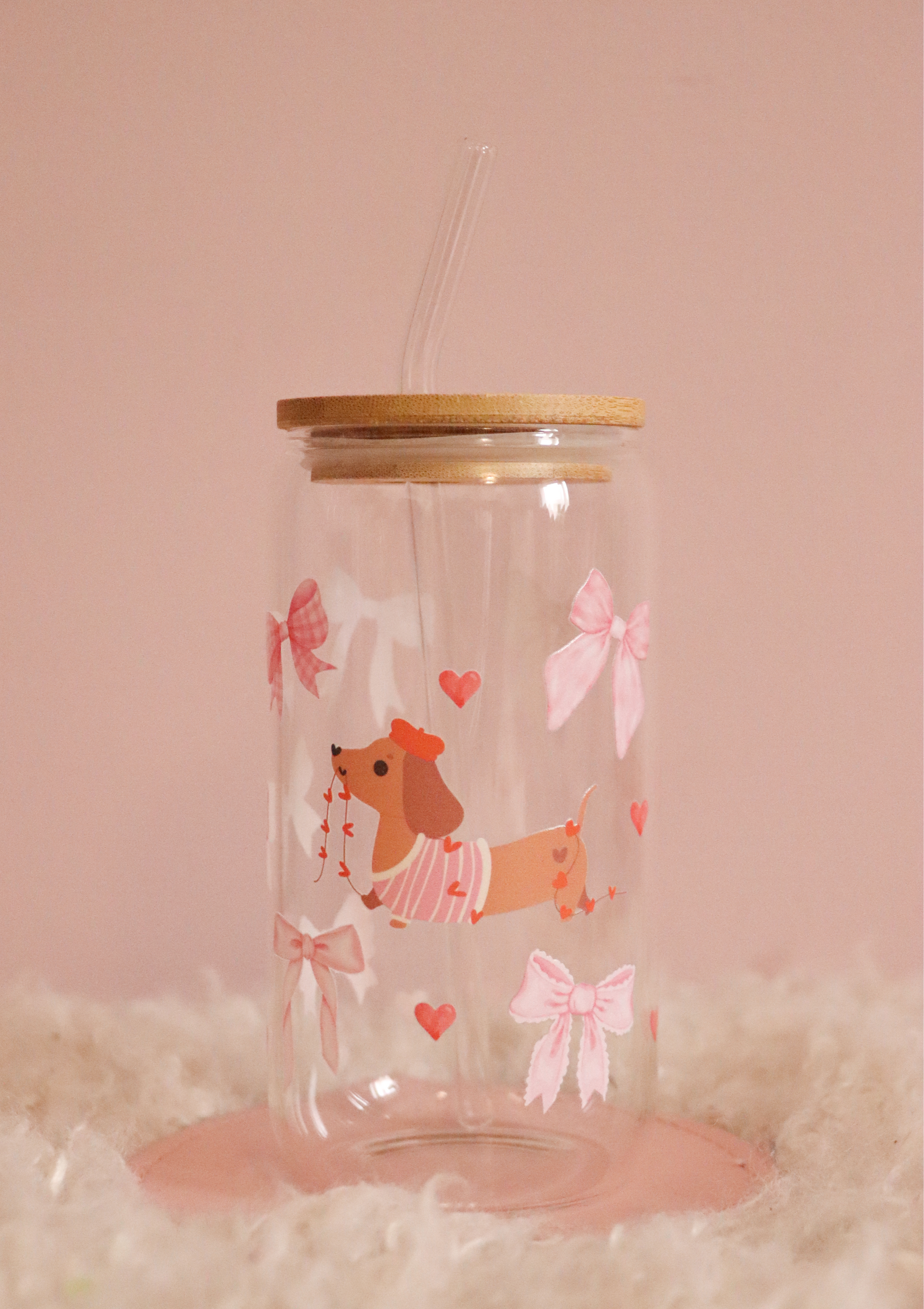 Sip in style with this adorable 17oz glass cup featuring a playful dachshund design, complete with pink bows and sweet little hearts! Topped with a sleek bamboo lid, it's perfect for keeping your favorite drinks fresh and fun. Whether you're a dachshund lover or just obsessed with all things cute, this cup is paws-itively perfect for everyday use!