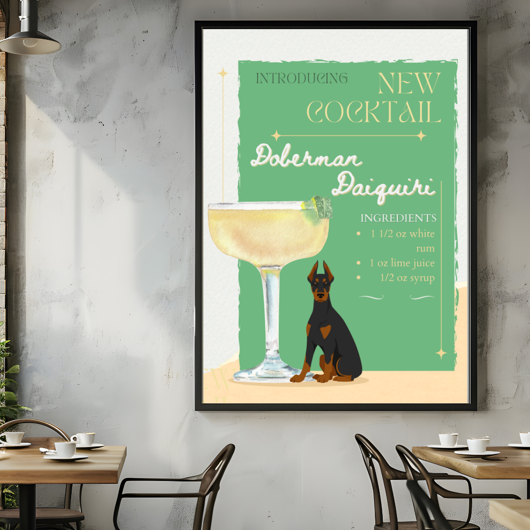 Introducing the "Doberman Daiquiri" from the dog cocktail collection, a must-have for doberman lovers or as a great gift option. You also have the choice of 2 fur coat colours and their ears to resonate with your dog!