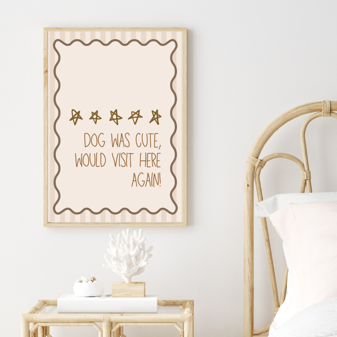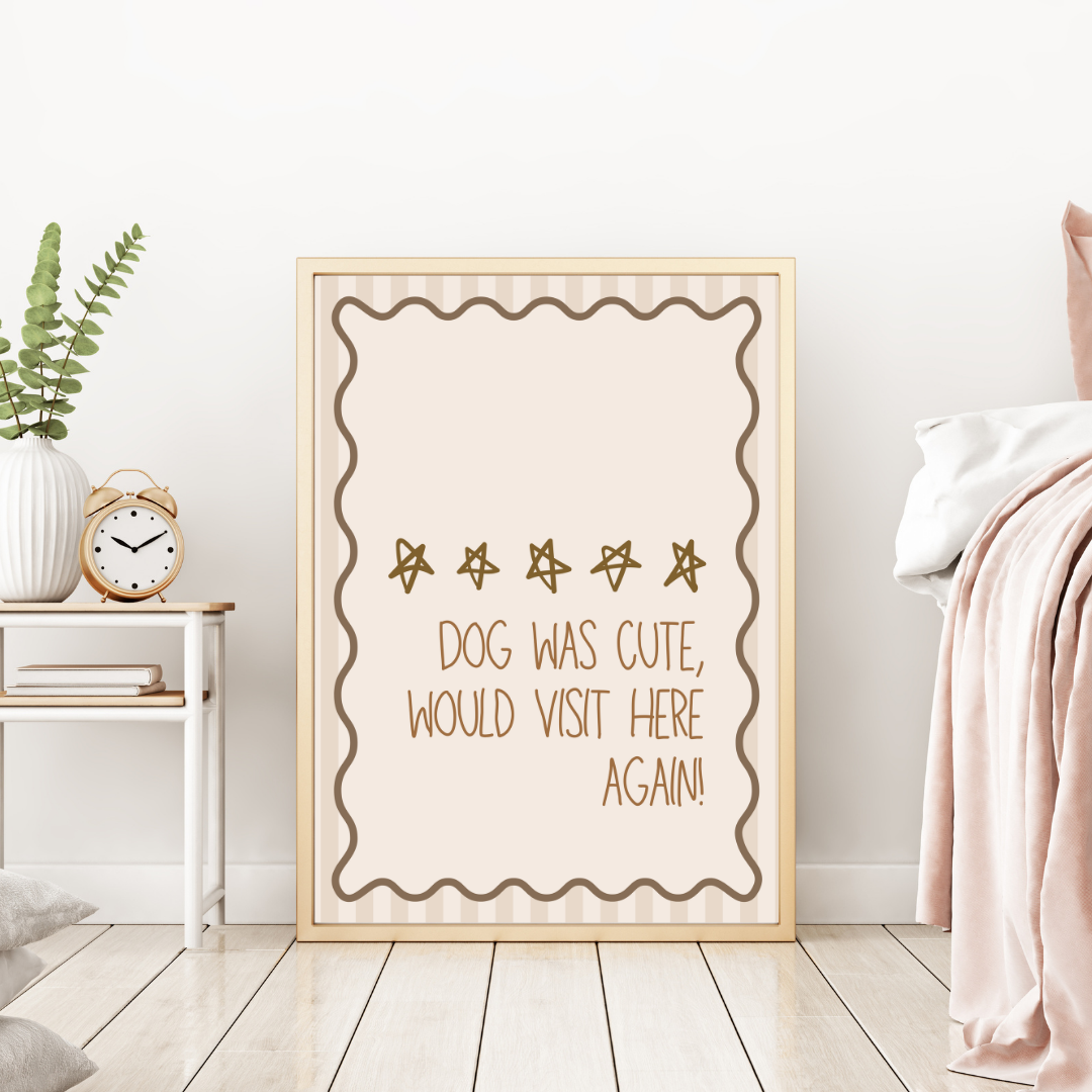Bring instant charm and a smile to your space with this playful, five-star–worthy art print. Featuring the cheeky review “Dog was cute, would visit here again” paired with a bold, brown stripey background, this piece is the perfect mix of humor, personality, and warm aesthetic.