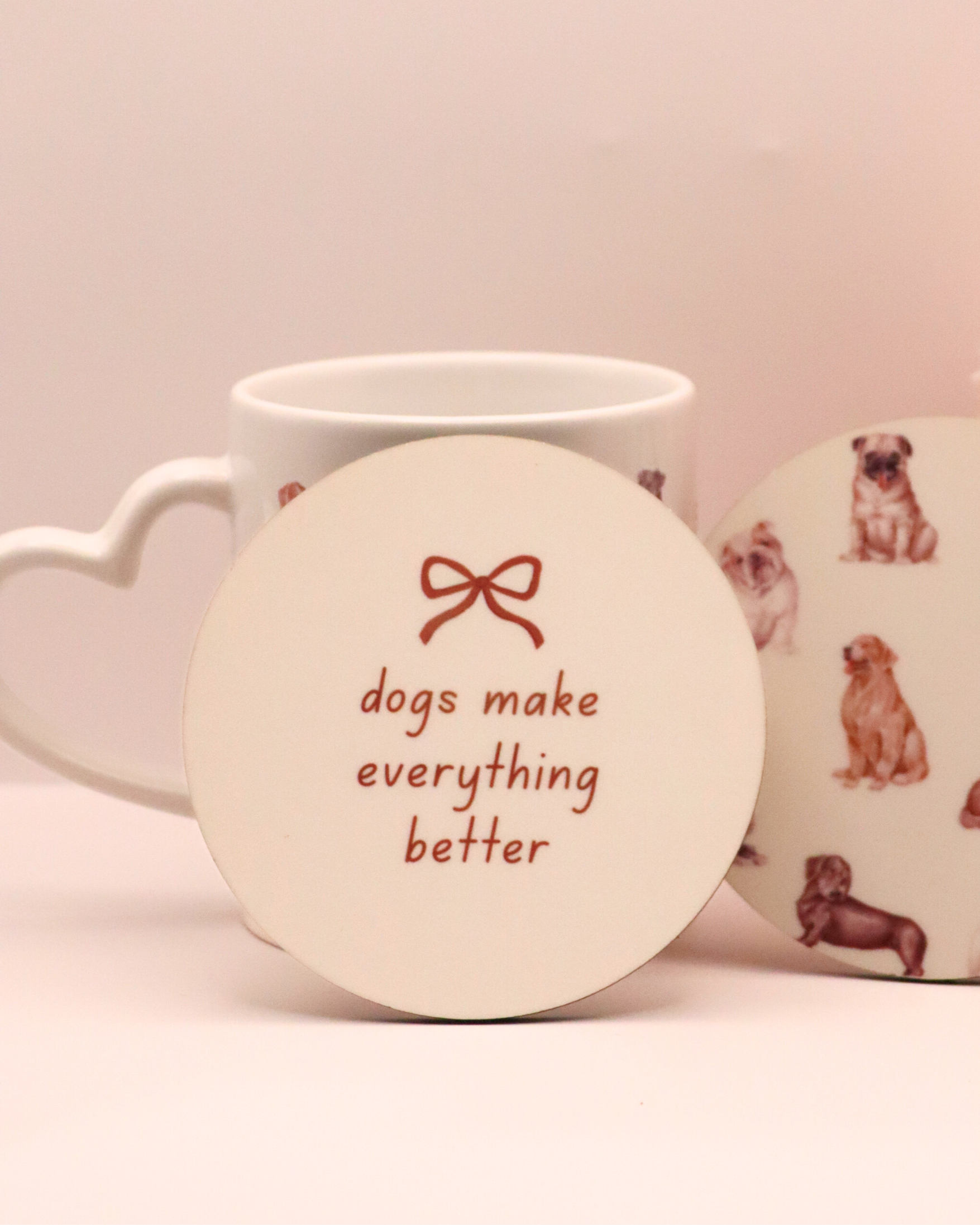 This adorable set of 2 coasters features sweet brown bows and the heart-warming phrase: “dogs make everything better.” and a coaster covered in adorable dog illustrations.