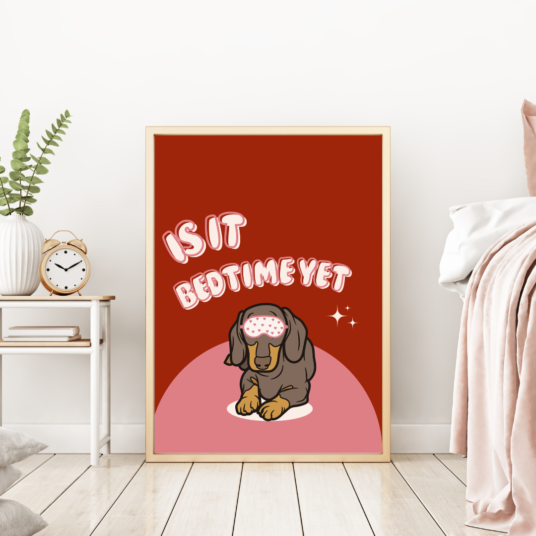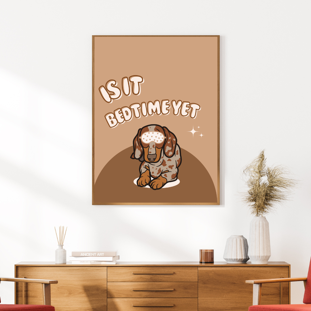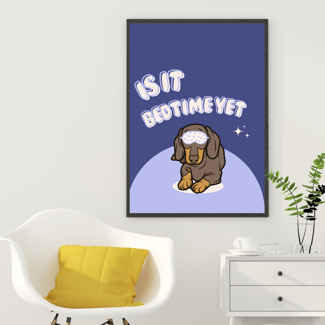 Introducing our dachshund-themed bedroom wall poster 'Is It Bedtime Yet?', perfect for any dachshund lover's home. This print features a unique design of a dachshund adding a fun and playful touch to any room. This print is available in three colours to suit your chosen space.