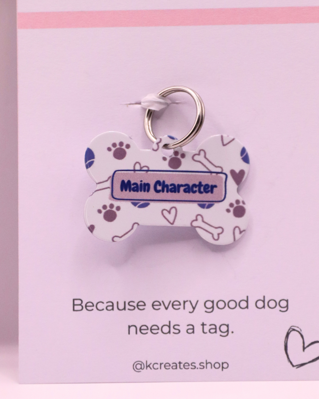 Let your pup shine in the spotlight with our Main Character dog tag! Featuring a vibrant blue background with playful balls and bones, this tag proudly declares your dog’s star status. The design is printed on both sides, so everyone can see your pup’s main character energy!