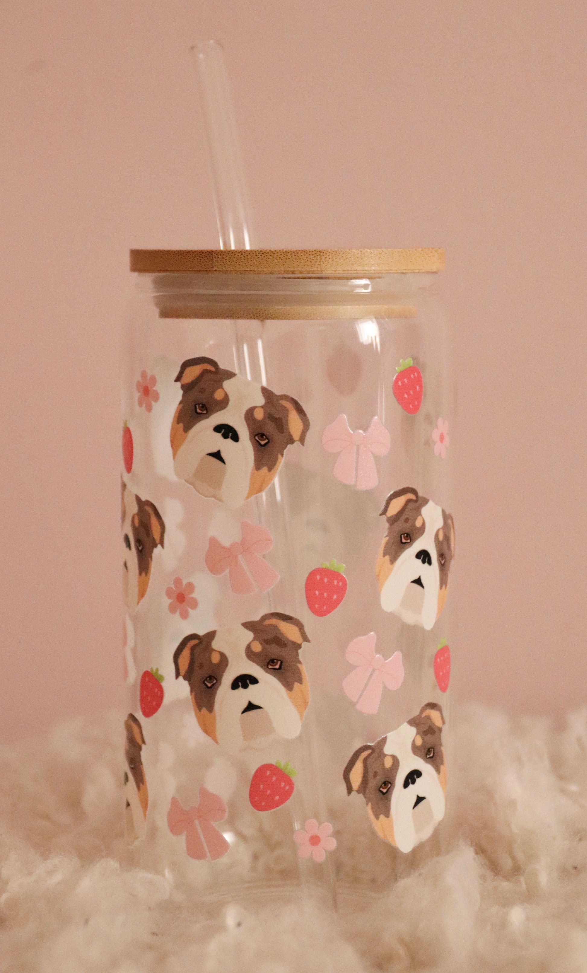 This 17oz bamboo glass cup is perfect for bulldog lovers! It features a merle English Bulldog with pink bows, pink flowers and strawberries. The most unique and fun cup you need to match your dog!