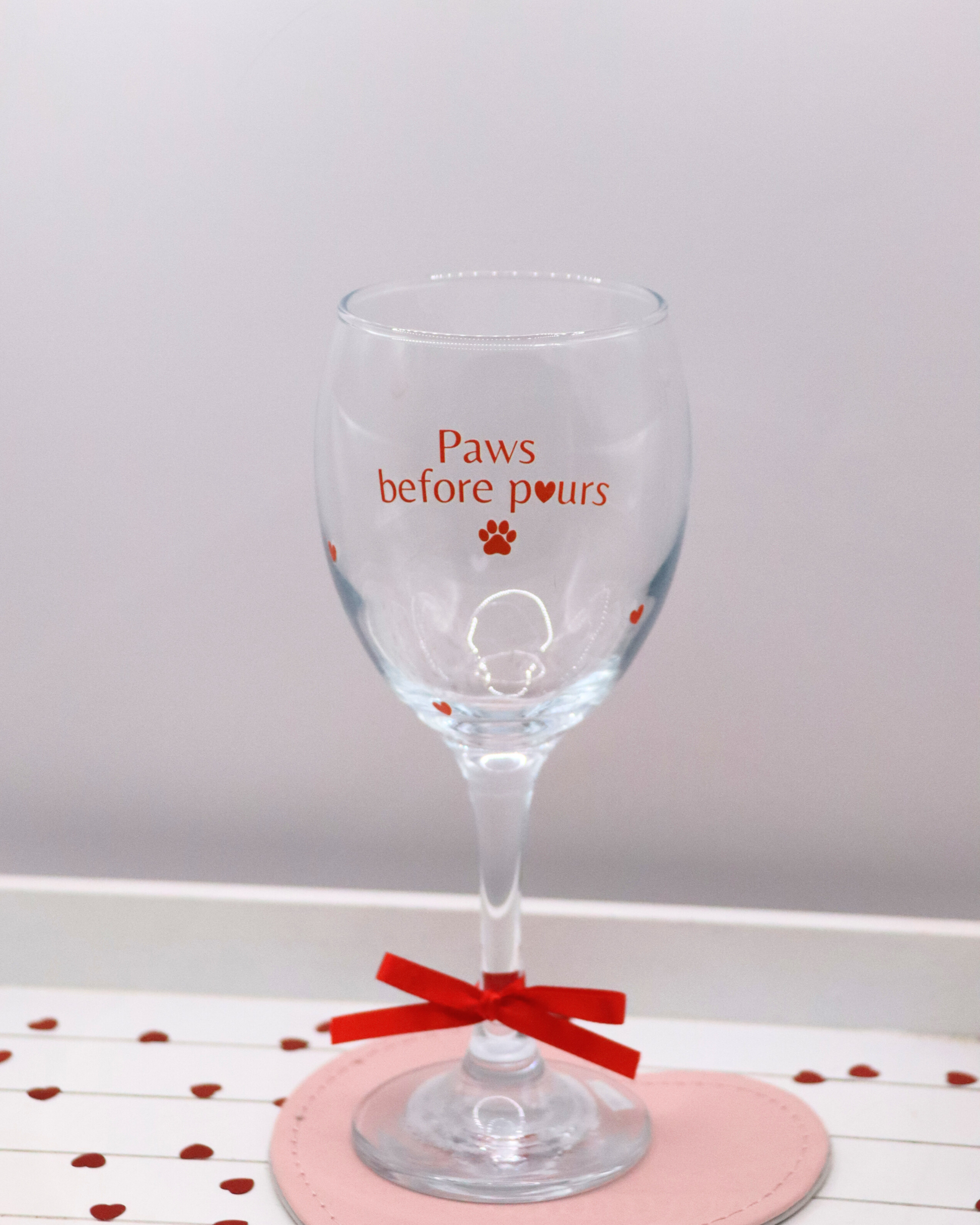This charming wine glass features the playful phrase “Paws Before Pours” surrounded by sweet red hearts, making it a must-have for dog lovers who never forget what really comes first (okay… almost first).