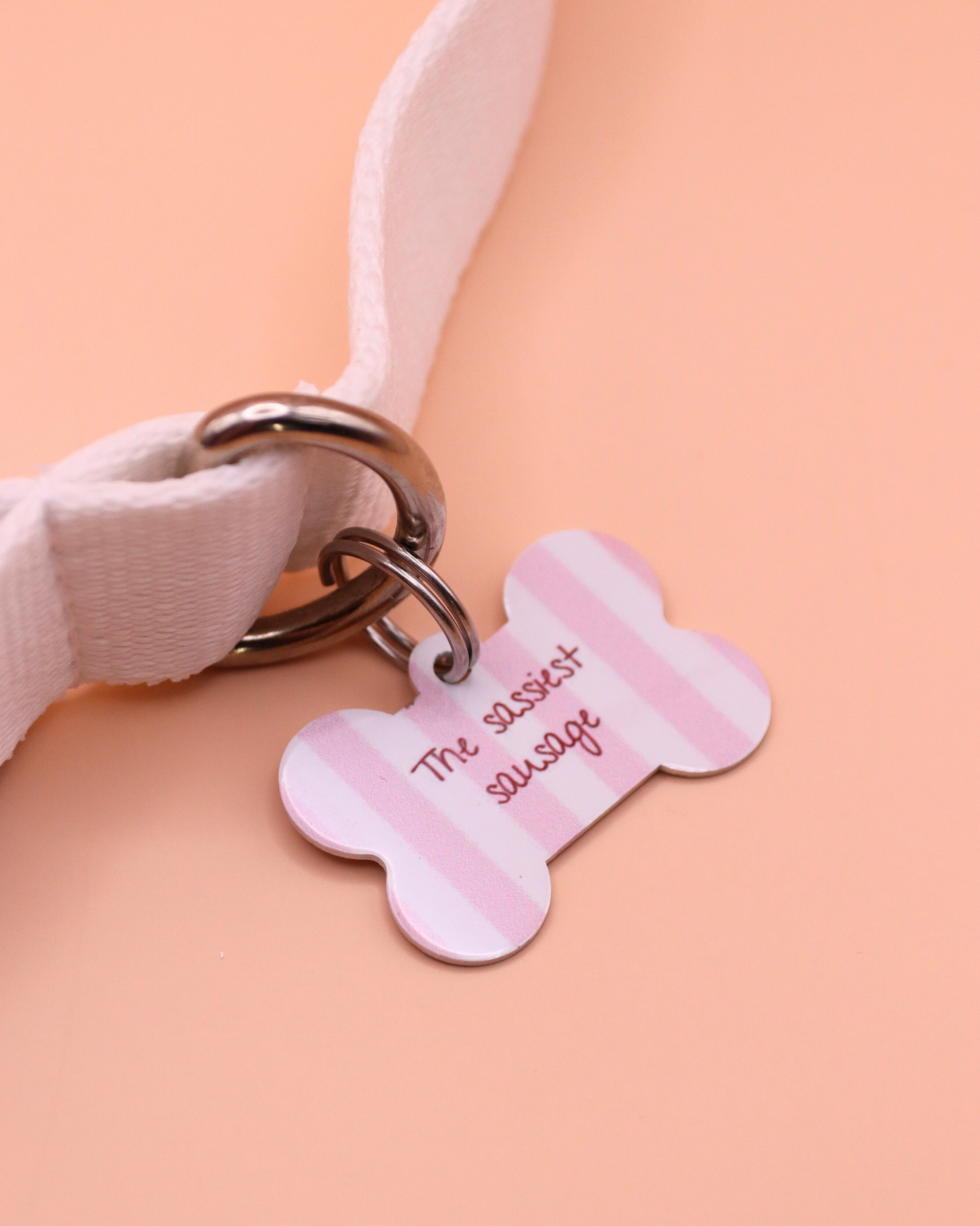 Add a pop of personality to your dachshund’s collar with our Sassy Sausage dog tag! Crafted from durable aluminum, this lightweight tag features a fun pink and white stripey design and the cheeky phrase “Sassy Sausage” printed on both sides – perfect for your long-bodied best friend.