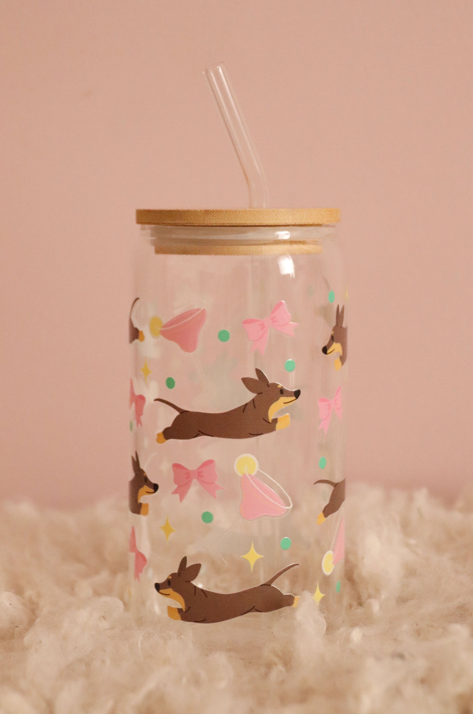 This 17oz bamboo glass cup is perfect for dachshund lovers! It features dashing dachshunds and cocktails, with pink bows, yellow stars and green pokka dots inspired by the 'Strawberry Dashuiri' print!