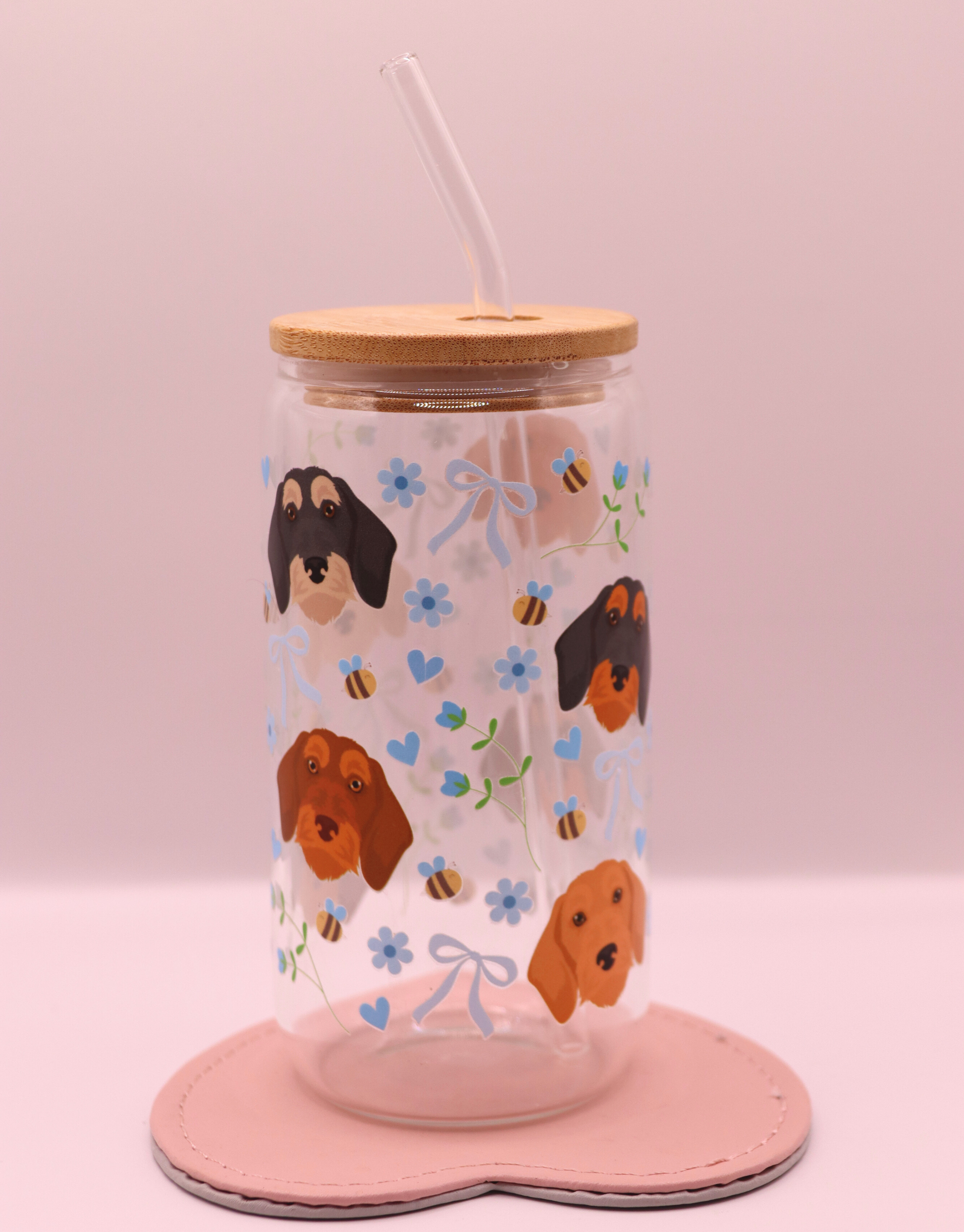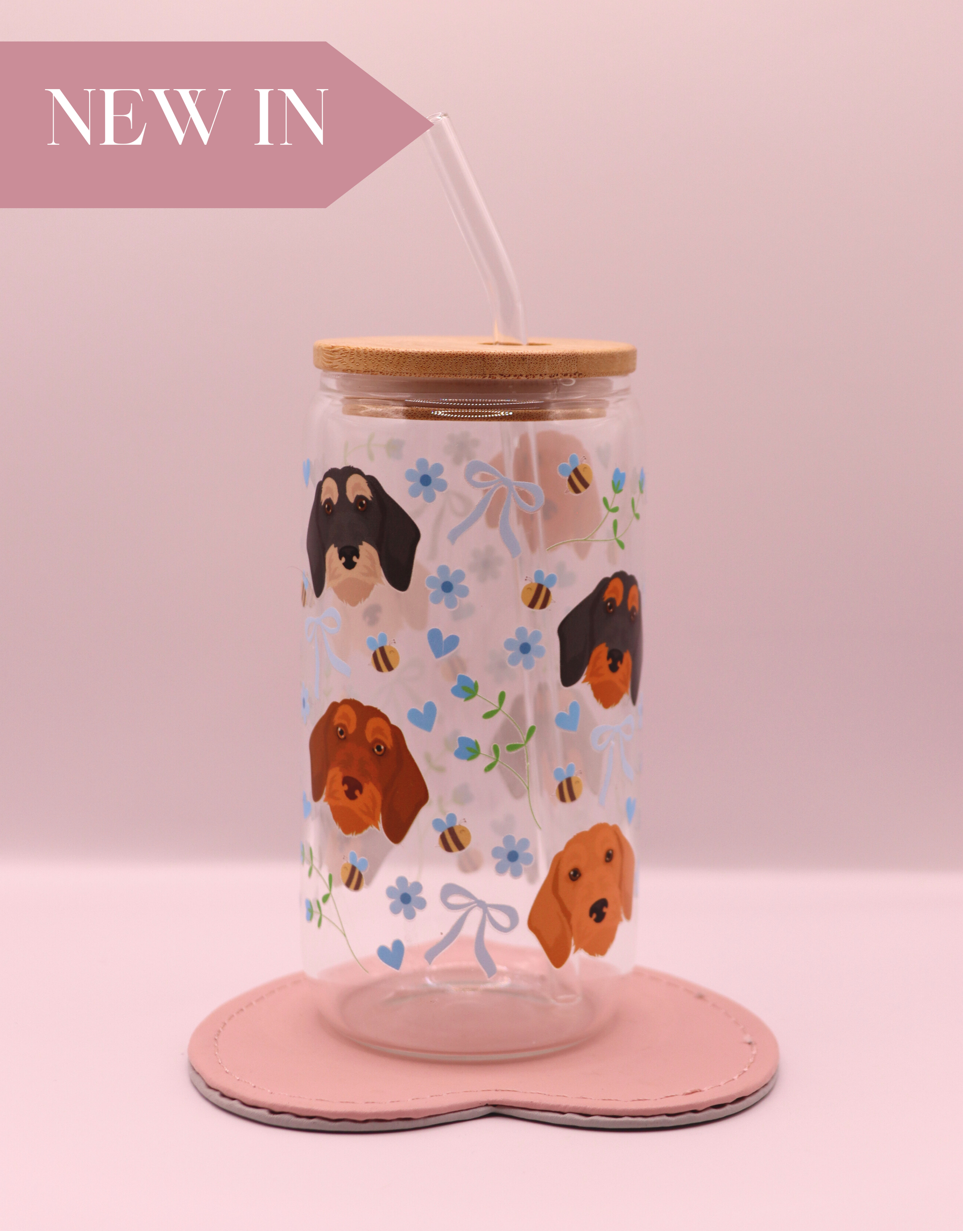 NEW IN - This 17oz bamboo glass cup is perfect for wirehaired dachshund lovers! It features different fur colours of wirehaired dachshunds faces surrounded by blue bows, bees and flowers! The design is sweet, cheerful, and full of personality.